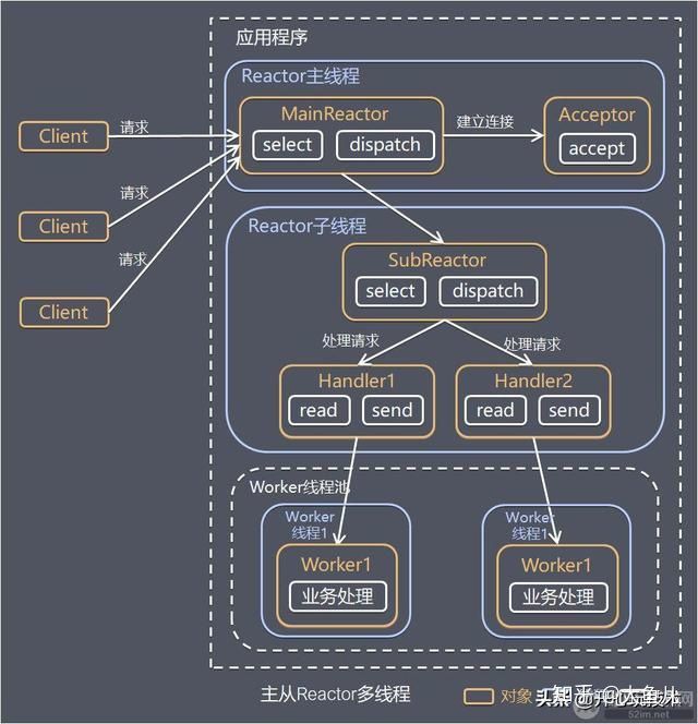 • 1)Reactor:Reactor 在一个单独的线程中运行,负责监听和分发事件,分发给适当的处理程序来对 IO 事件做出反应。 它就像公司的电话接线员,它接听来自客户的电话并将线路转移到适当的联系人;